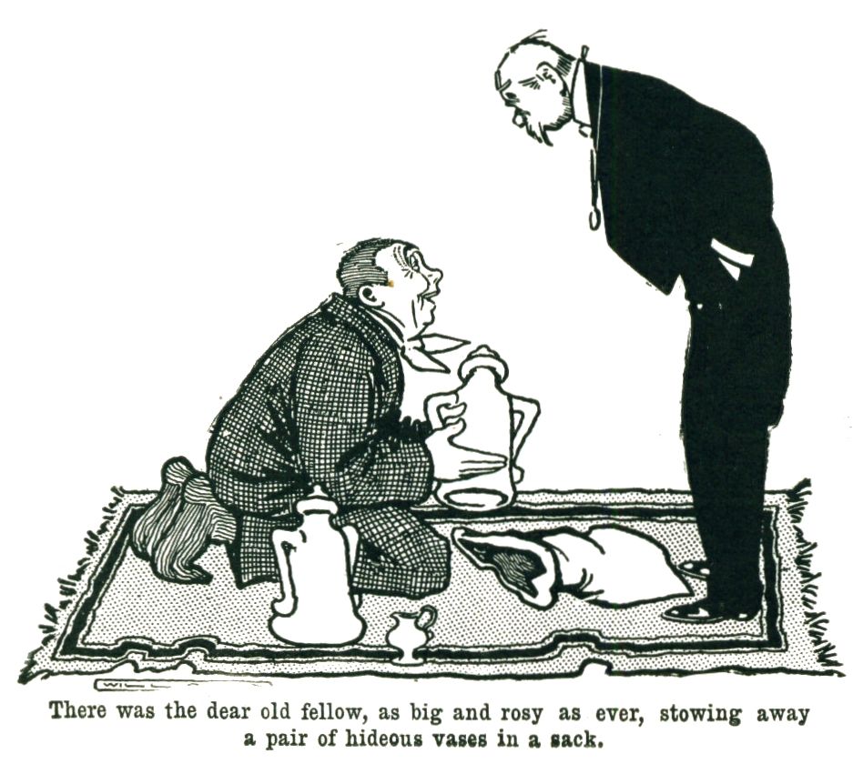 “My connection, small at first, has extended until I now number among my clients most of the best-known names in the land. It is the ideal existence. Large profits. No risks. I insist on a cheque in advance, and if I am bitten by the dog of the house in the execution of my professional duties an extra ten pounds is always added. Young couples idolise me. They are no longer haunted by terrible gifts from rich relations, which they dare not lose or give away. They send for me. I remove the horrors, and the delighted owners explain to the donor that it was doubtless the magnificence and costliness of the stolen article which led the burglar to carry it away and nothing else but it. So that everybody’s happy. In the present case, these vases, which I shall abstract when I have finished this really excellent cigar, were presented to our host a week ago by a wealthy aunt. Unspeakably foul, are they not?”
