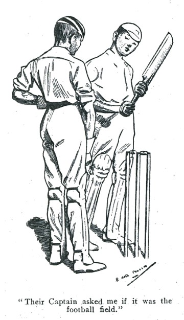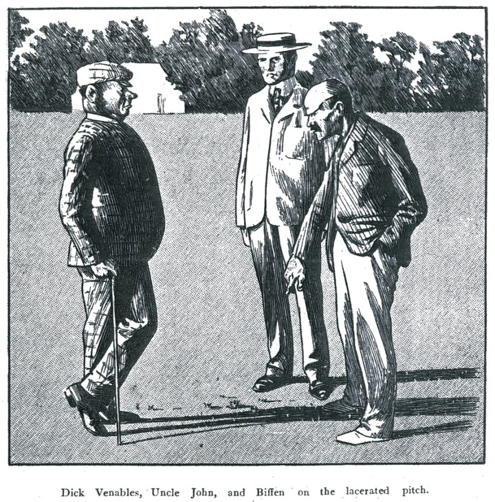 Dear Doll,—Thanks awfully for your letter, and thank Jim for his message. He’s a ripper. I’m awfully glad you married him and not that rotter, Thompson, who used to hang on so. I hope the most marvellous infant on earth is flourishing. And now about Uncle John. Really, I am jolly glad I did say all that to him. We played Rugborough yesterday, and the wicket was simply vile. They won the toss, and made two hundred and ten. Of course, the wicket was all right at one end, and that’s where they made most of their runs. I was wicket-keeping as usual, and I felt awfully ashamed of the beastly pitch when their captain asked me if it was the football-field. Of course, he wouldn’t have said that if he hadn’t been a pal of mine, but it was probably what the rest of the team thought, only they were too polite to say so. When we came to bat it was worse than ever. I went in first with Welch—that’s the fellow who stopped a week at home a few years ago; I don’t know whether you remember him. He got out in the first over, caught off a ball that pitched where Uncle John had been prospecting, and jumped up. It was rotten luck, of course, and worse was to follow, for by half-past five we had eight wickets down for just over the hundred, and only young Scott, who’s not a bat at all, and another fellow to come in. Well, Scott came in. I had made about sixty then, and was fairly well set—and he started simply mopping up the bowling. He gave a chance every over as regular as clockwork, and it was always missed, and then he would make up for it with two or three tremendous whangs—a safe four every time. It wasn’t batting. It was more like golf. Well, this went on for some time, and we began to get hopeful again, having got a hundred and eighty odd. I just kept up my wicket, while Scott hit. Then he got caught, and the last man, a fellow called Moore, came in. I’d put him in the team as a bowler, but he could bat a little, too, on occasions, and luckily this was one of them. There were only eleven to win, and I had the bowling. I was feeling awfully fit, and put their slow man clean over the screen twice running, which left us only three to get. Then it was over, and Moore played the fast man in grand style, though he didn’t score. Well, I got the bowling again, and half-way through the over I carted a half-volley into the pav., and that gave us the match. Moore hung on for a bit and made about ten, and then got bowled. We made 223 altogether, of which I had managed to get seventy-eight, not out. It pulls my average up a good bit. Rather decent, isn’t it? The fellows rotted about a good deal, and chaired me into the pav., but it was Scott who won us the match, I think. He made ninety-four. But Uncle John nearly did for us with his beastly walking-stick. On a good wicket we might have made any number. I don’t know how the affair will end. Keep me posted up in the governor’s symptoms, and write again soon.—Your affectionate brother, Dick.