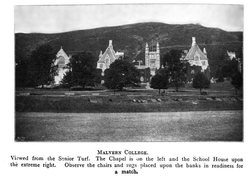Below the Senior turf is the middle or Junior turf, east of which stand the College baths. On this ground there is a tree that gets behind the bowler’s arm, or, rather, the bowler’s arm gets in front of the tree, and indignant batsmen write to the “Malvernian” suggesting that it shall be whitewashed or blown up with Lyddite.