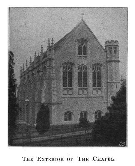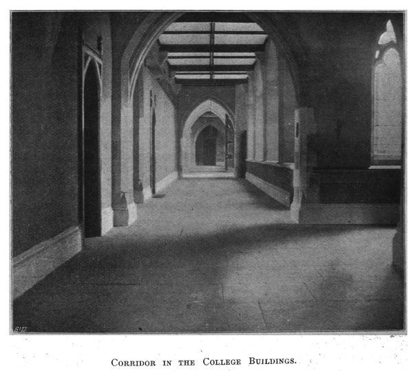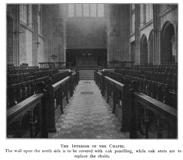 In 1885 Mr. Cruttwell retired in favour of the Rev. William Grundy, late Fellow of Worcester College, Oxford. His term of mastership lasted till 1891, and was marked by rapid and vigorous progress. The numbers of the school reached three hundred and twenty-three, the Staff was increased in proportion, and the College so far overflowed its accommodation as to necessitate the old Sanatorium being converted into a class-room. But Mr. Grundy’s success was cut short by death on December 5th, 1891. A permanent memorial, bearing his name, exists in the Grundy Library, which occupies the whole upper floor of the old Sanatorium. The new Head Master was the Rev. A. St. John Gray. To him is due the erection of the College Chapel, which, though still incomplete in detail, is a really noble building. It was dedicated in June, 1899.