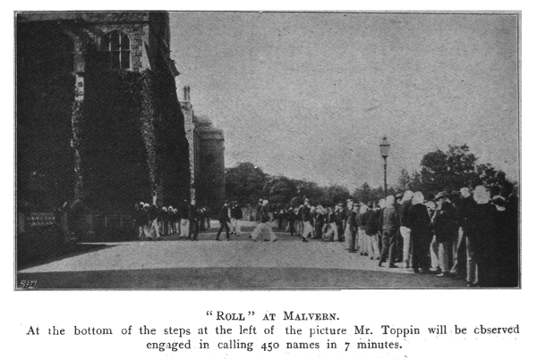 This change may be attributed almost entirely to the arrival of Mr. Toppin, to whom Malvern cricket owes a great debt. “He introduced into the game a thorough system and organization,” says the “Malvern Register,” “It became gradually, under his supervision, an intense reality, and when once the wheel of fortune turned, it turned completely. The game as it is played in the school leaves but little to be desired from the point of view of school cricket. The practice games are well arranged and kept up to the mark, and every boy is reached by a careful system of inspection of the lists of the various clubs.”