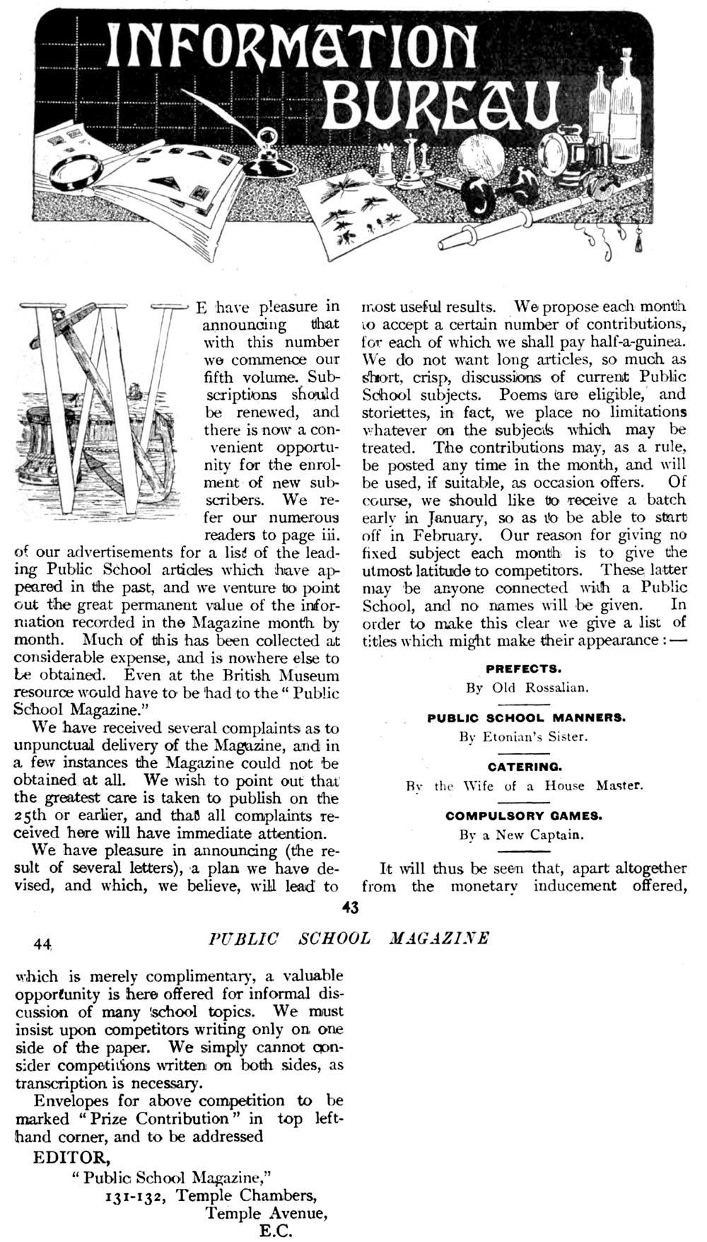 This complete set of Wodehouse’s contributions to Public School Magazine has been freshly checked and revised against images of the original magazine during 2013–14, with some new ✎ annotations. As you enjoy these items, remember that Wodehouse was employed by the Hong Kong and Shanghai Bank from September 1900 to September 1902, so nearly all of this was written outside office hours, while he was proving to himself that he could earn his living solely by writing. Keep in mind, too, that he was eighteen to twenty years old at the time; he would turn 21 in October 1902, five weeks after chucking the Bank for full-time writing.