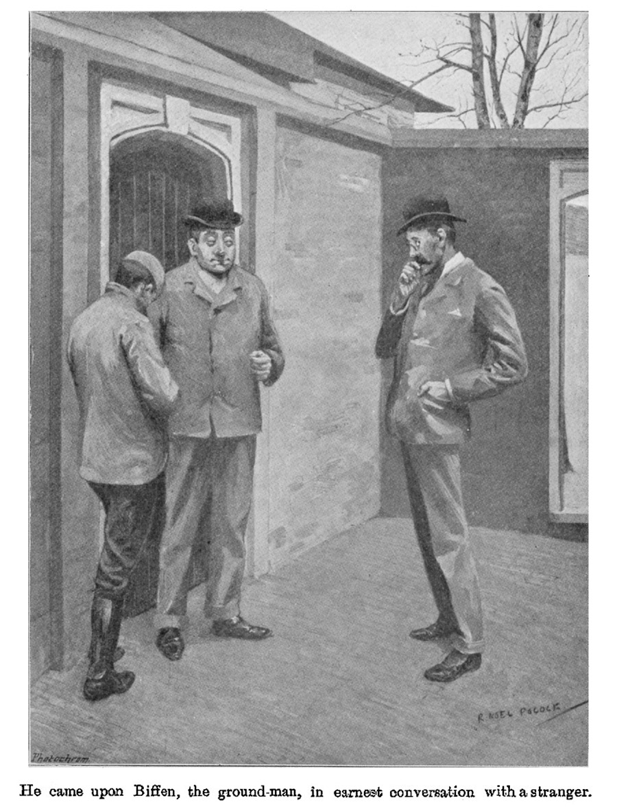 He was making his way to the place where the ground-man was usually to be found, with a view to obtaining the keys, when he noticed that the door was already open, and on going thither he came upon Biffen, the ground-man, in earnest conversation with a stranger.