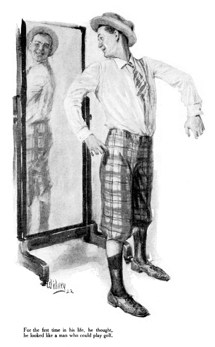 Even so was it with Wallace Chesney and these plus fours. At first he had recoiled from them as any decent-minded man would have done. Then, after a while, almost abruptly he found himself in the grip of a new emotion. After an unsuccessful attempt to analyze this, he suddenly got it. Amazing as it may seem, it was pleasure that he felt. He caught his eye in the mirror, and it was smirking. Now that the things were actually on, by Hutchison, they didn’t look half bad. By Braid, they didn’t! There was a sort of something about them. Take away that expanse of bare leg with its unsightly sock-suspender, and substitute a woolly stocking, and you would have the lower section of a golfer. For the first time in his life, he thought, he looked like a man who could play golf.