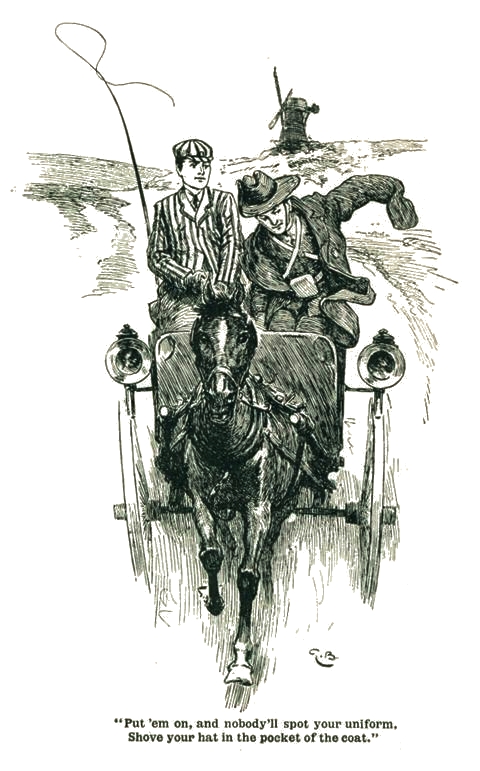 “That’s all right,” said Neville-Smith, “I thought of that. Reach behind you, and you’ll find a long dust-coat. I brought it on purpose; and there’s a King’s straw there, too. Put ’em on, and nobody’ll spot your uniform. Shove your hat in the pocket of the coat.”
