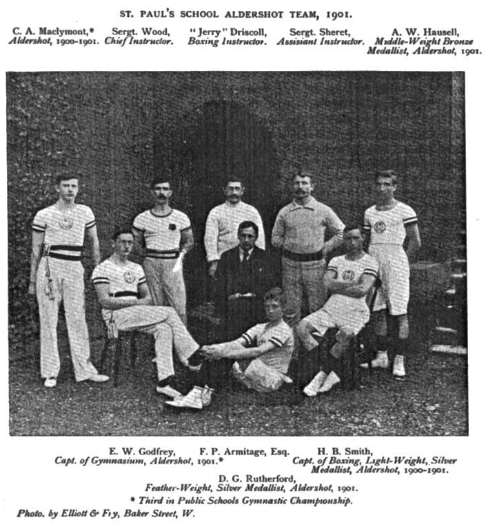 OF all inter-school contests the annual Boxing, Fencing, and Gymnastic Competition, held at Aldershot in the last days of March or the first days of April, is, with the possible exception of the Ashburton Shield Meeting, the most important and representative. Forty or more schools compete in gymnastics, and about twenty in the fencing and sabres. The boxing usually claims between thirty-five and forty entries, most schools sending up more than one representative. There are four classes—feather-weights, not exceeding 9 st.; light-weights, anything up to 10 st.; middles, 11 st. 4 lb. and under; and heavies, any weight. With the exception of St. Paul’s, who generally enter a man for each weight, most of the schools limit themselves to two champions, usually in two of the lighter weights. The heavy-weight medals are sometimes contested for by only two pairs of fighters.