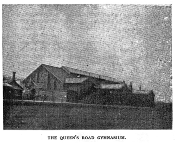 The Queen’s Road Gymnasium is large and lofty, an ideal place for such a competition. One end of the building is reserved for the boxing, and it is here that the bulk of the audience collects. Give the average Briton the choice between a warm turn-up with the gloves and the best of gymnastic displays, and he will generally choose the former.