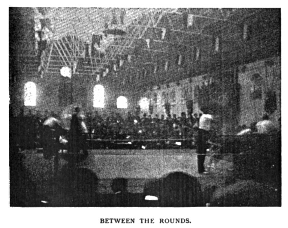 The pair seat themselves in their respective corners, each having two seconds allotted to him. These gentlemen certainly do their duty by him both physically and morally, now submitting his legs and arms to a vigorous massage, now indicating verbally the straight and narrow way to pugilistic salvation, in both cases with as much earnestness as if they had their last penny on him in the fight. His trainer and teacher, the school instructor, also adds his word of advice.