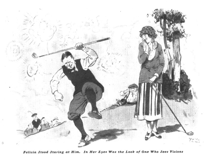 “Love her?” he cried, his voice vibrating with emotion. “Of course I love her! Who wouldn’t love her? I’d be a silly chump not loving her. Do you know,” the boy went on, a look in his eyes like that of some young knight seeing the Holy Grail in a vision—“do you know, she is the only woman I ever met who didn’t overswing? Just a nice, crisp, snappy half slosh, with a good full follow through. And another thing. You’ll hardly believe me, but she waggles almost as little as George Duncan. You know how women waggle as a rule, fiddling about for a minute and a half like kittens playing with a ball of wool. Well, she just makes one firm pass with the club and then—bing! There is none like her—none.”