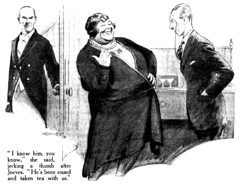 “You do not appear to be aware of it, Jeeves,” I said, in a cold, level voice, “but this binge has depreciated your stock very considerably. I have always been accustomed to look upon you as a counsellor without equal. I have, so to speak, hung upon your lips. And now see what you have done. All this is the direct consequence of your scheme, based on the psychology of the individual. I should have thought, Jeeves, that, knowing the woman—meeting her socially, as you might say, over the afternoon cup of tea—you might have ascertained that she was Uncle George’s barmaid.”