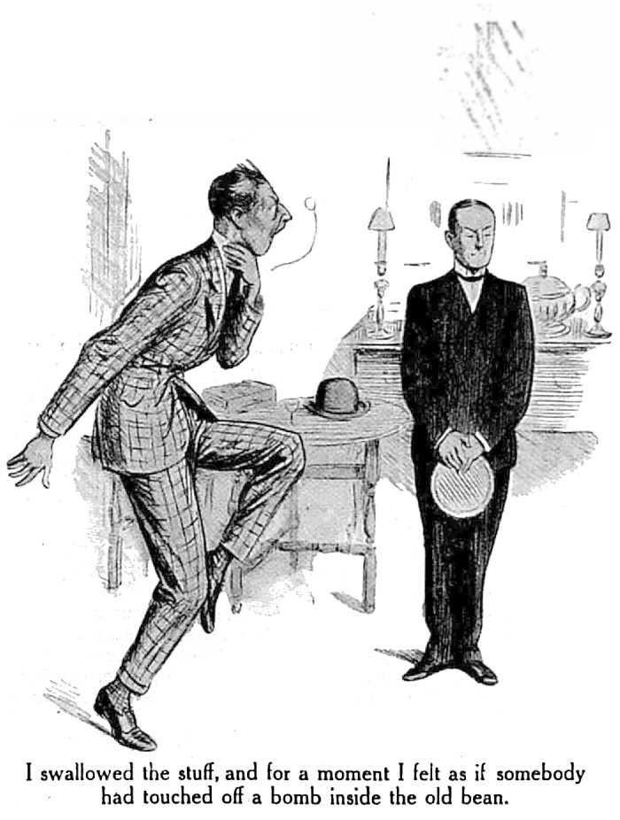 I would have clutched at anything that looked like a life-line that morning. I swallowed the stuff. For a moment I felt as if somebody had touched off a bomb inside the old bean, and was strolling down my throat with a lighted torch, and then everything seemed suddenly to get all right. The sun shone in through the window; birds twittered in the tree-tops; and, generally speaking, hope dawned once more.