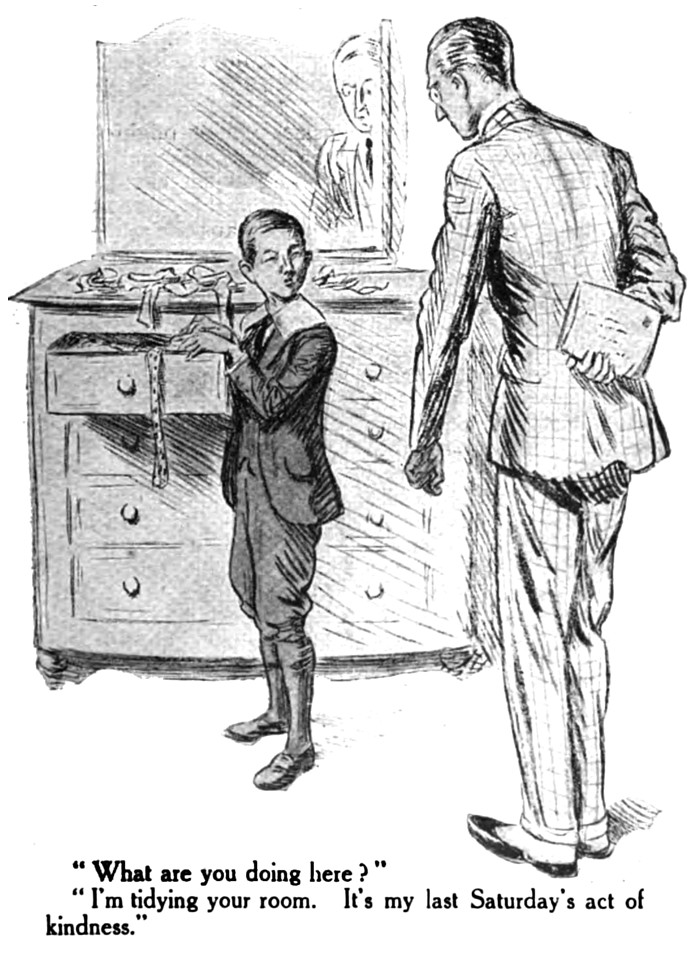 “Oh, Bertie!” he said, without a blush, “I have—ah—received a telegram from Berkeley, who occupied this room in your absence, asking me to forward him his—er—his cigarette-case, which, it would appear, he inadvertently omitted to take with him when he left the house. I cannot find it downstairs; and it has, therefore, occurred to me that he may have left it in this room. I will—er—just take a look round.”