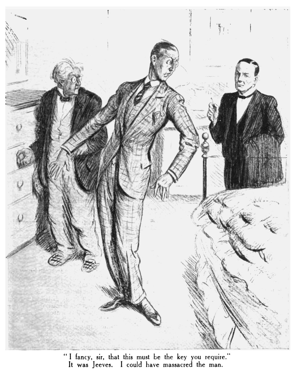 It was Jeeves. He had shimmered in, carrying my evening things, and was standing there holding out the key. I could have massacred the man.