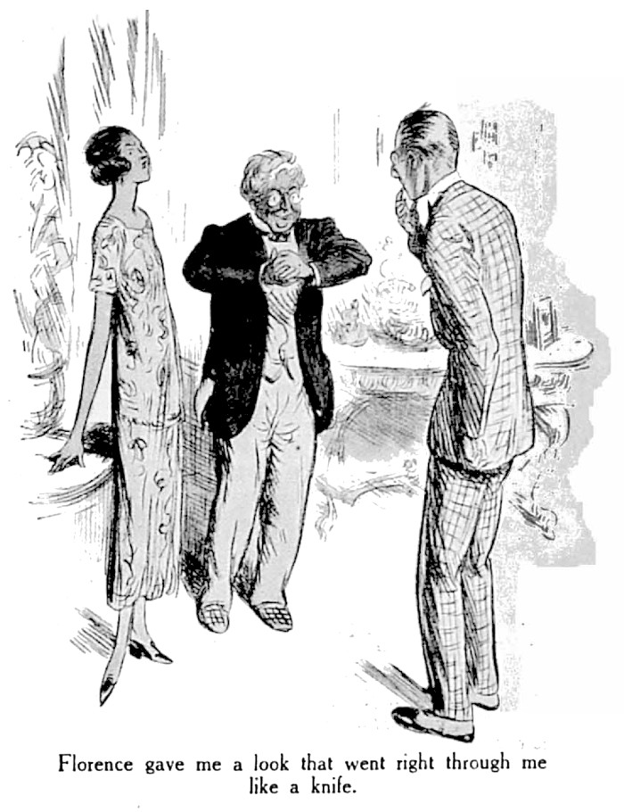 When I got to the house, Oakshott, the butler, told me that Florence was in her room, watching her maid pack. Apparently there was a dance on at a house about twenty miles away that night, and she was motoring over with some of the Easeby lot and would be away some nights. Oakshott said she had told him to tell her the moment I arrived; so I trickled into the smoking-room and waited, and presently in she came. A glance showed me that she was perturbed, and even peeved. Her eyes had a goggly look, and altogether she appeared considerably pipped.