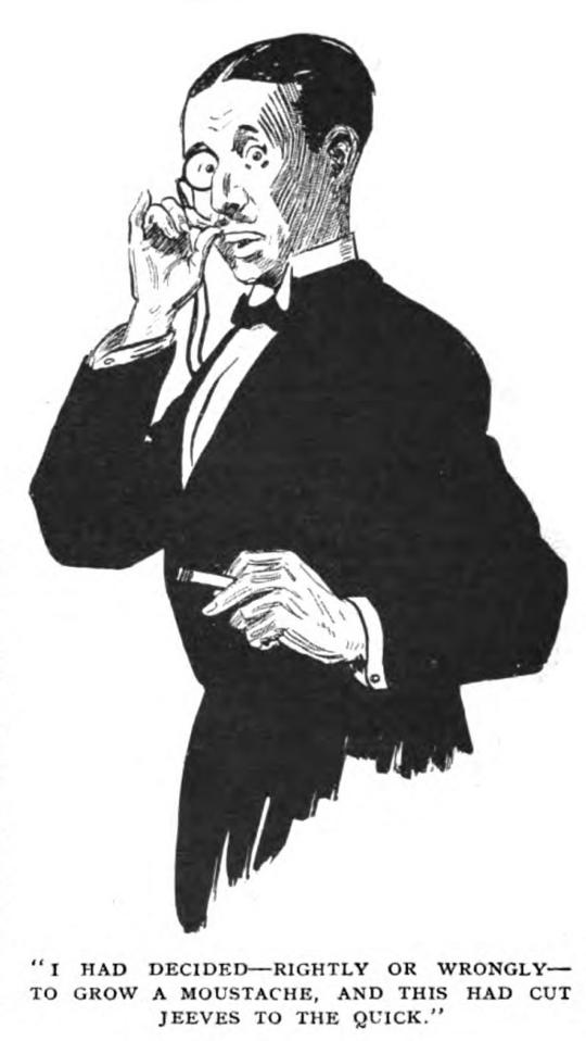 I sipped the whisky. I was sorry if Bicky was in trouble, but, as a matter of fact, I was rather glad to have something I could discuss freely with Jeeves just then, because things had been a bit strained between us for some time, and it had been rather difficult to hit on anything to talk about that wasn’t apt to take a personal turn. You see, I had decided—rightly or wrongly—to grow a moustache, and this had cut Jeeves to the quick. He couldn’t stick the thing at any price, and I had been living ever since in an atmosphere of bally disapproval till I was getting jolly well fed up with it. What I mean is, while there’s no doubt that in certain matters of dress Jeeves’ judgment is absolutely sound and should be followed, it seemed to me that it was getting a bit too thick if he was going to edit my face as well as my costume. No one can call me an unreasonable chappie, and many’s the time I’ve given in like a lamb when Jeeves has voted against one of my pet suits or ties; but when it comes to a valet’s staking out a claim on your upper lip you’ve simply got to have a bit of the good old bulldog pluck and defy the blighter.