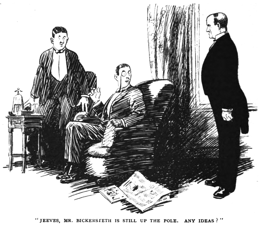 “Halloa, Bicky!” I said. “Jeeves told me you had been trying to get me. Jeeves, bring another glass, and let the revels commence. What’s the trouble, Bicky?”