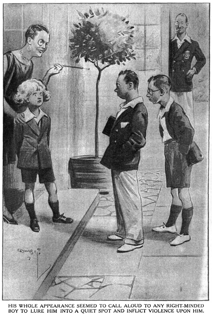 I’M bound to say that the spectacle of little Sebastian when he arrived two days later did much to remove pessimism from my outlook. If ever there was a kid whose whole appearance seemed to call aloud to any right-minded boy to lure him into a quiet spot and inflict violence upon him, that kid was undeniably Sebastian Moon. He reminded me very strongly of Little Lord Fauntleroy. I marked young Thos.’s demeanour closely at the moment of their meeting, and, unless I was much mistaken, there came into his eyes the sort of look which would come into those of an Indian chief—Chinchagook, let us say, or Sitting Bull—just before he started reaching for his scalping-knife. He had the air of one who is about ready to begin.