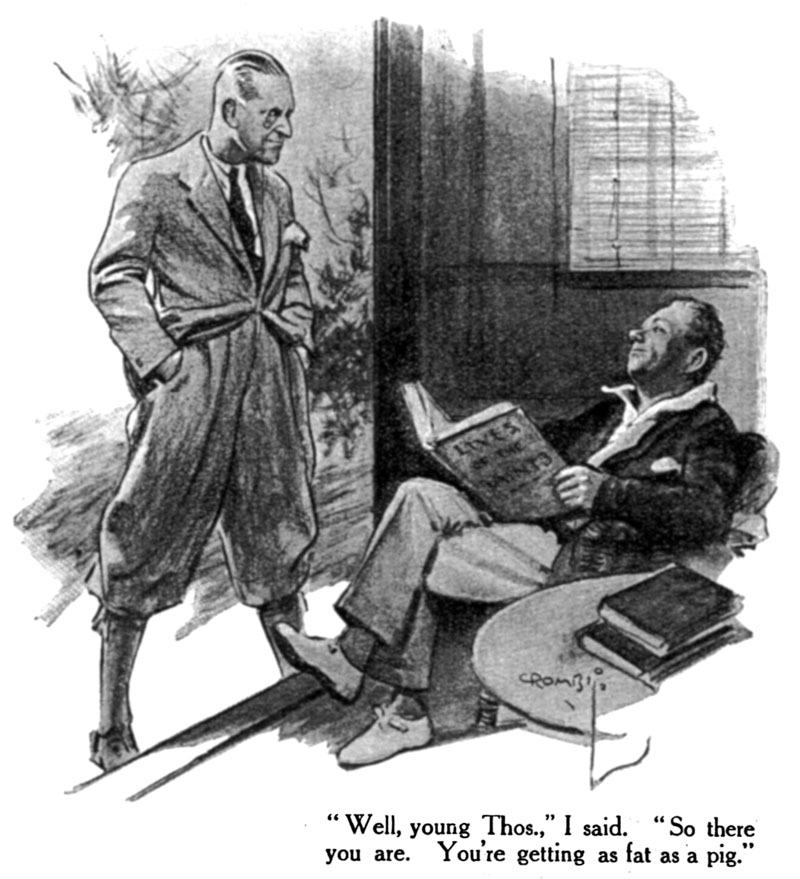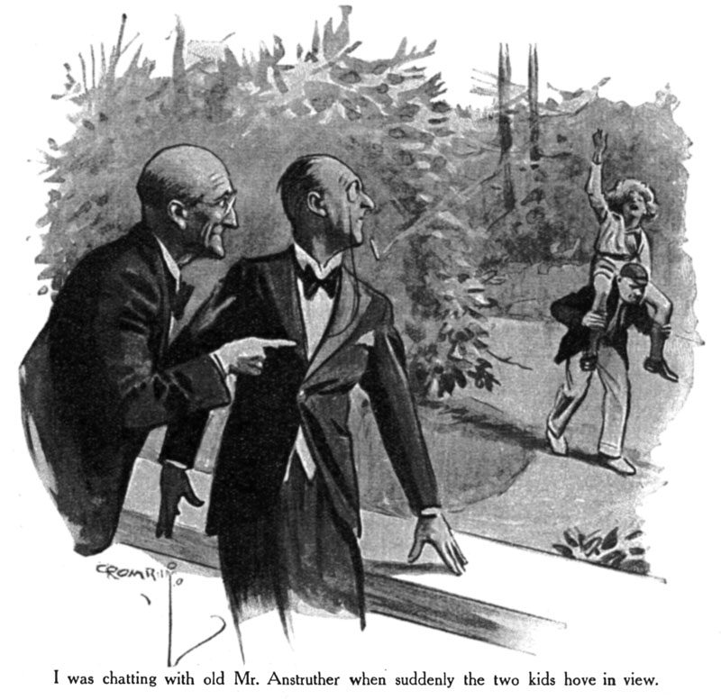 Down below, things were hotting up nicely. Old Mr. Anstruther may have been frail, but he undoubtedly had his moments. I have rarely seen a man of his years conduct himself with such a lissom abandon. There was a stick lying beside the chair, and with this in hand he went into action like a two-year-old. A moment later he and Thos. had passed out of the picture round the side of the house, Thos. cutting out a rare pace, but, judging from the sounds of anguish, not good enough to distance the field.