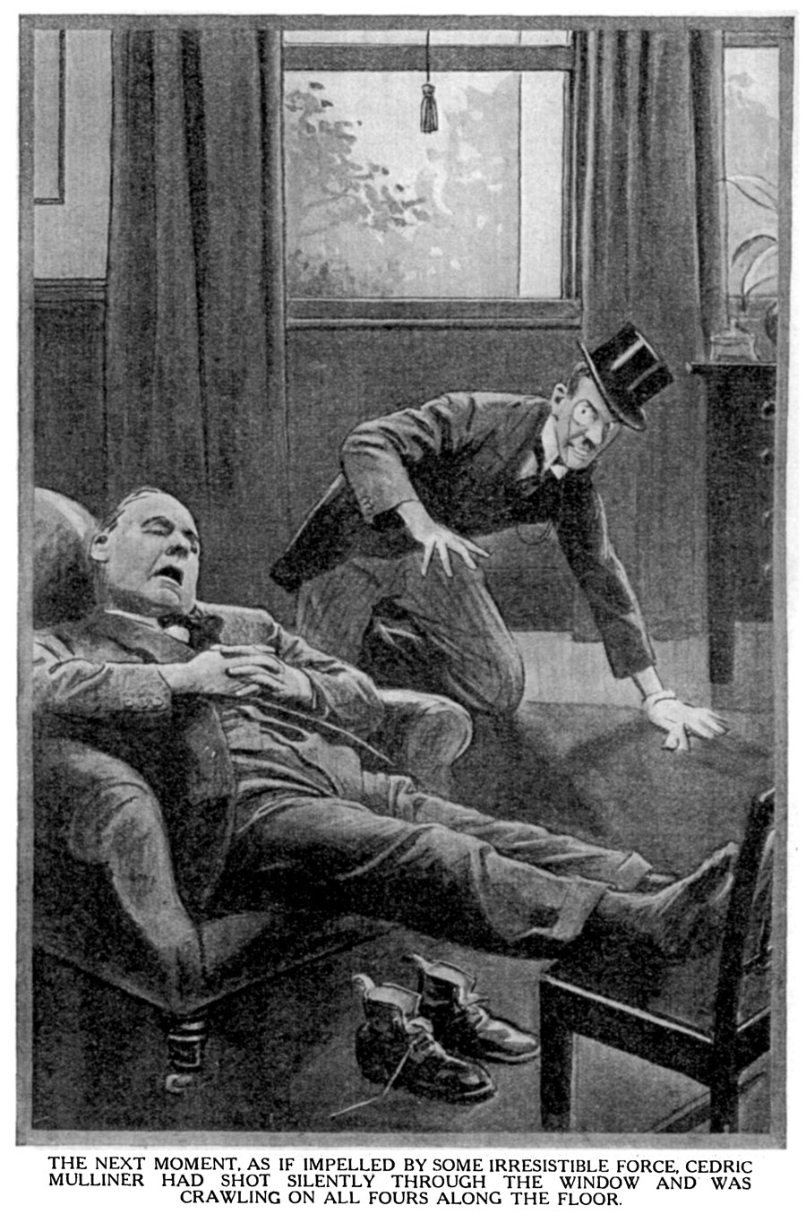 The next moment, as if impelled by some irresistible force, Cedric Mulliner had shot silently through the window and was crawling on all fours along the floor. His teeth were clenched, and his eyes gleamed with a strange light. If he had not been wearing a top-hat, he would have been an almost exact replica of the hunting-leopard of the Indian jungle stalking its prey.