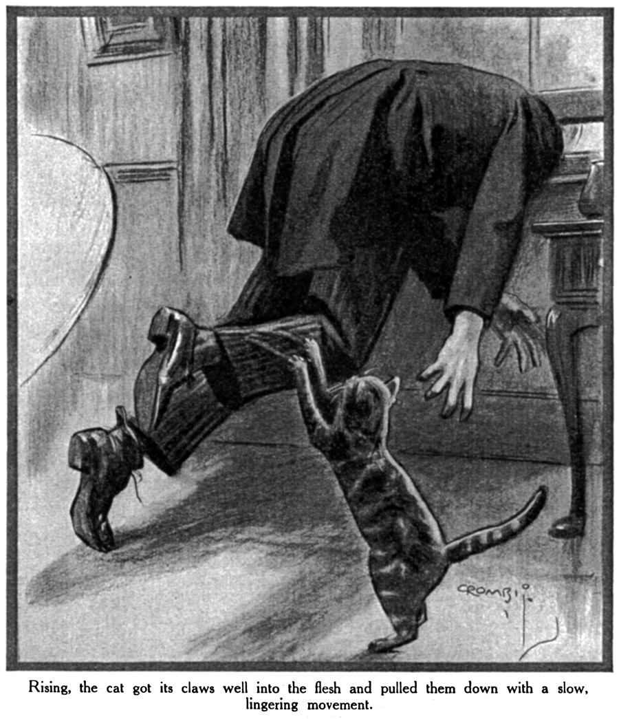 To the more meditative type of cat there comes at irregular intervals a strange, dreamy urge to stand on its hind legs and sharpen its claws on the nearest perpendicular object. This is usually a tree, but in the present case, there being no tree to hand, the ginger-coloured cat inside the room had made shift with Cedric’s right calf. Absently, its mind revolving who knows what abstruse subjects, it blinked once or twice; then, rising, got its claws well into the flesh and pulled them down with a slow, lingering motion.