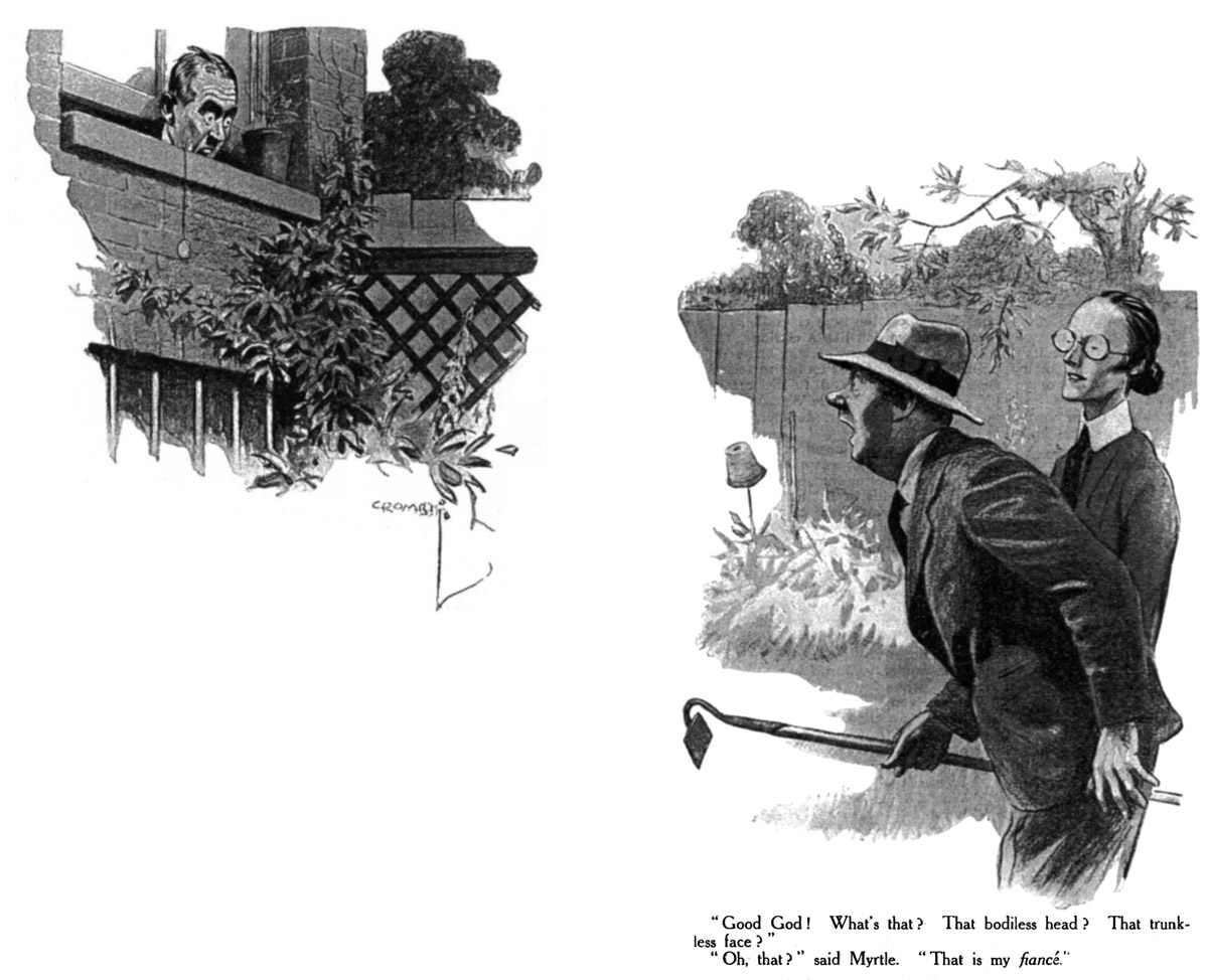 “Somebody must have done it. Possibly it is the work of a gang. Sinister things are happening in this house. I tell you, Jane, that Seven, Nasturtium Villas, has suddenly—and on Sunday, too, which makes it worse—become a house of mystery. I shall be vastly surprised if, before the day is out, clutching hands do not appear through the curtains and dead bodies drop out of the walls. I don’t like it, Jane, and I tell you so frankly. Stand out of my way, woman, and let me get at those weeds.”