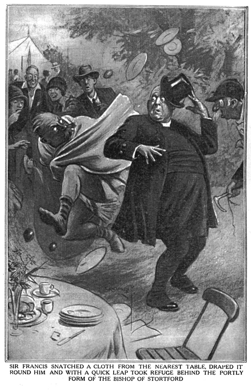 Three minutes later the revellers on the lawn were interested to observe a sight rare at the better class of English garden-party. Out of a clump of laurel-bushes that bordered the smoothly mown turf there came charging a stout, pink gentleman of middle age who hopped from side to side as he ran. He was wearing a loincloth and seemed in a hurry. They had just time to recognize in this new-comer their host’s brother, Colonel Sir Francis Pashley-Drake, when he snatched a cloth from the nearest table, draped it round him, and with a quick leap took refuge behind the portly form of the Bishop of Stortford, who was talking to the local Master of Hounds about the difficulty he had in keeping his vicars off the incense.