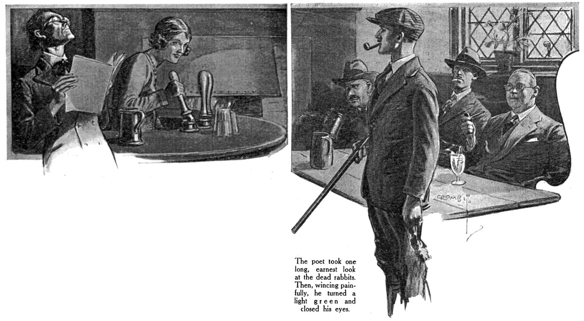 THE poet who was spending the summer at the Anglers’ Rest had just begun to read us his new sonnet-sequence when the door of the bar-parlour opened and there entered a young man in gaiters. He came quickly in and ordered beer. In one hand he was carrying a double-barrelled gun, in the other a posy of dead rabbits. These he dropped squashily to the floor; and the poet, stopping in mid-sentence, took one long, earnest look at the remains. Then, wincing painfully, he turned a light green and closed his eyes. It was not until the banging of the door announced the visitor’s departure that he came to life again.
