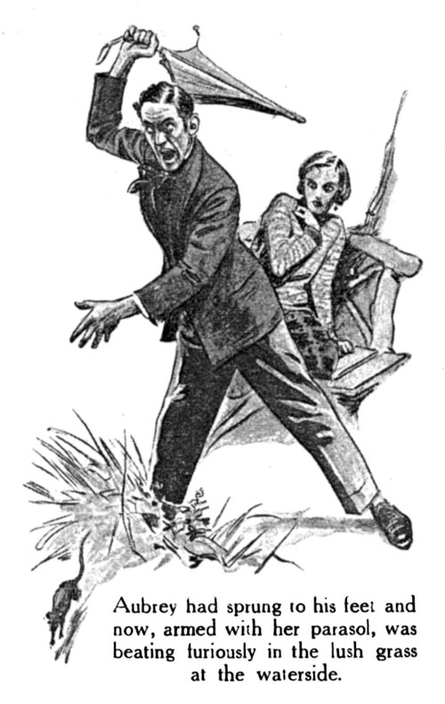 She stared round-eyed at Aubrey. He had released her hand, sprung to his feet, and now, armed with her parasol, was beating furiously in the lush grass at the waterside. And every little while his mouth would open, his head would go back, and uncouth sounds would proceed from his slavering jaws.