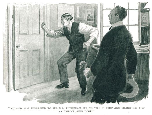 Mr. Petheram was a young man with a mop of hair, spectacles, and an air of almost painful restraint, as if it were only by willpower of a high order that he kept himself from bounding about like a Dervish. He was in his shirt-sleeves, and the table before him was heaped high with papers. Opposite him, evidently in the act of taking his leave, was a comfortable-looking man of middle age, with a red face and a short beard. He left as Roland entered, and Roland was surprised to see Mr. Petheram spring to his feet, shake his fist at the closing door, and kick the wall with a vehemence which brought down several inches of discoloured plaster.
