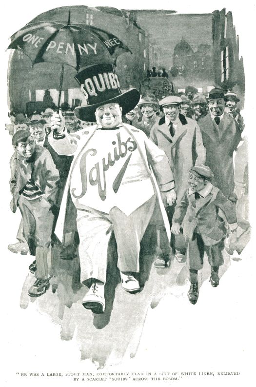 As he stood cooling his indignation in the pleasant breeze which had sprung up, he was aware of a dense crowd proceeding towards him. It was headed by an individual who shone out against the drab background like a good deed in a naughty world. Nature hath framed strange fellows in her time, and this was one of the strangest that Roland’s bulging eyes had ever rested upon. He was a large, stout man, comfortably clad in a suit of white linen, relieved by a scarlet “Squibs” across the bosom. His top-hat, at least four sizes larger than any top-hat worn out of a pantomime, flaunted the same word in letters of flame. His umbrella, which, though the weather was fine, he carried open above his head, bore the device, “One Penny Weekly.”