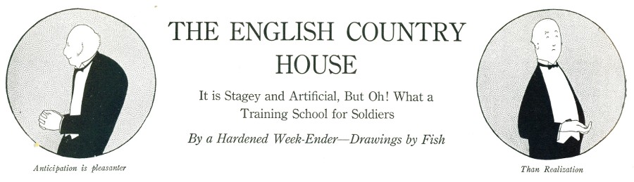 THE lack of bathing facilities is not the only drawback to country-house visiting. Indeed, the keynote of the country-house may be said to be a kind of luxurious discomfort. The average party consists of people fifty percent of whom are meeting each other for the first time: they have from Friday or Saturday evening to Monday morning to get acquainted. This is about two years eleven months and a few days less than the minimum period in which the average Briton can get acquainted with anyone. An air of restraint broods over the gathering. Good-fellowship exists in patches, but the bulk of the temporary population of the house has the tense demeanour of those who have set themselves a task and mean to fulfil it. They have contracted to stay till Monday morning, and they mean to do it; but it is too much to expect them to do it rollickingly. I have seen week-enders at country-houses, who probably had no notion that they were not the life and soul of the party, pottering about in a dejected way that would have caused comment in a Siberian salt-mine. There seems to be no escape from this frame of mind. If your host is one of those hosts who believe in letting guests alone to amuse themselves, the probability is that the guests, being of the class who are not strong in the way of mental resources, will be passively bored. The active host, on the other hand, who hounds his guests and insists on their doing something all the time, whether they like it or not, is an active evil. It is a hard world.
