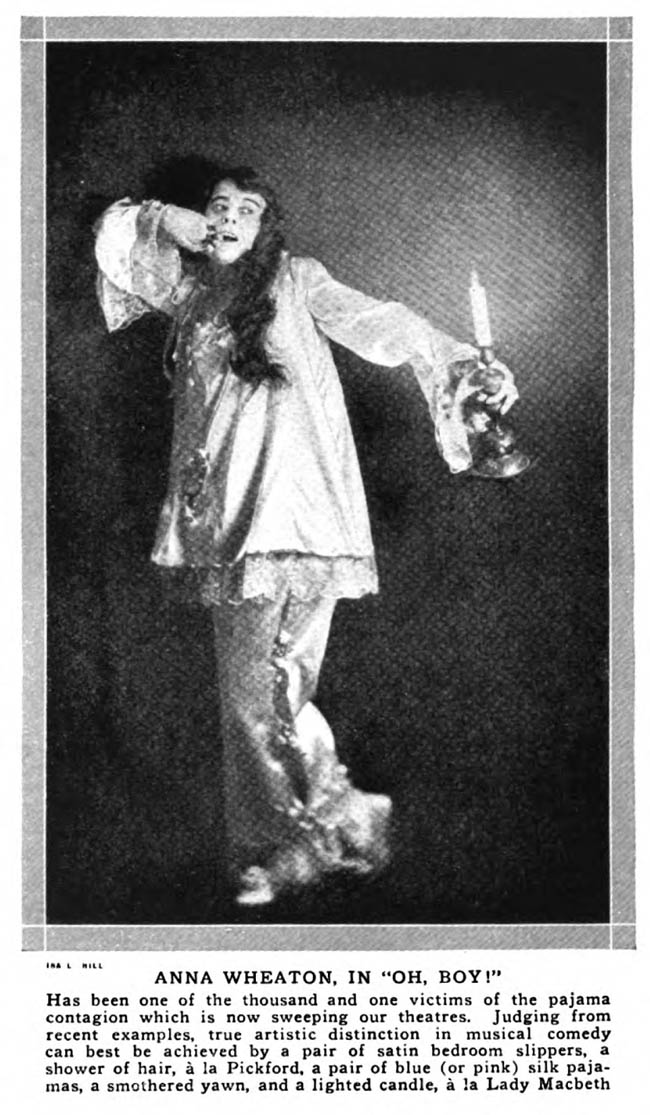 It was a banner season for pajamas, too. There were pink pajamas in “You’re in Love,” lilac pajamas in “Canary Cottage,” and blue pajamas (I believe I am correct, am I not, Miss Wheaton?) in “Oh, Boy!” (As a matter of fact, we put it, in our play, all over the pajama opposition, because we wove our pajamas into the plot of the piece, and you couldn’t dig them out with a chisel.) If I remember too, Ann Murdock wore some breed of pajamas in “Please Help Emily.” Anyway, the season was quite pajamanine, taking it all round.