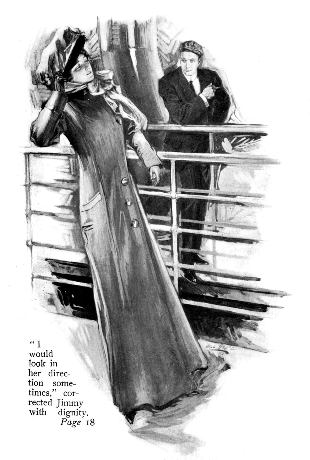 “I wonder what those men on the deck are writing. They’ve been scribbling away ever since we came here. Probably, society journalists. We shall see in next week’s papers: ‘Among the second-class passengers, we noticed Mr. “Spike” Mullins, looking as cheery as ever.’ It’s a pity you’re so set on going, Spike. Why not change your mind, and stop?”